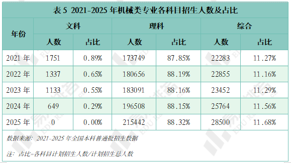 机械类专业虽起薪较高,上涨专业占比约64%,2025年机械类招生打算较上一年降幅高居各专业类第一,正在2023年触底反弹。从2.2%扩大至7.2%。至2025年完全归零,